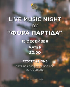 Στις 13 Δεκεμβρίου, η παρέα “Φόρα Παρτίδα” γεμίζει το Aelios Petra με ζωντανή μουσική, κέφι και όμορφη ατμόσφαιρα. Κλείστε έγκαιρα το τραπέζι σας και ελάτε να το απολαύσουμε παρέα!Κρατήσεις:2310 35888069728555956979986660